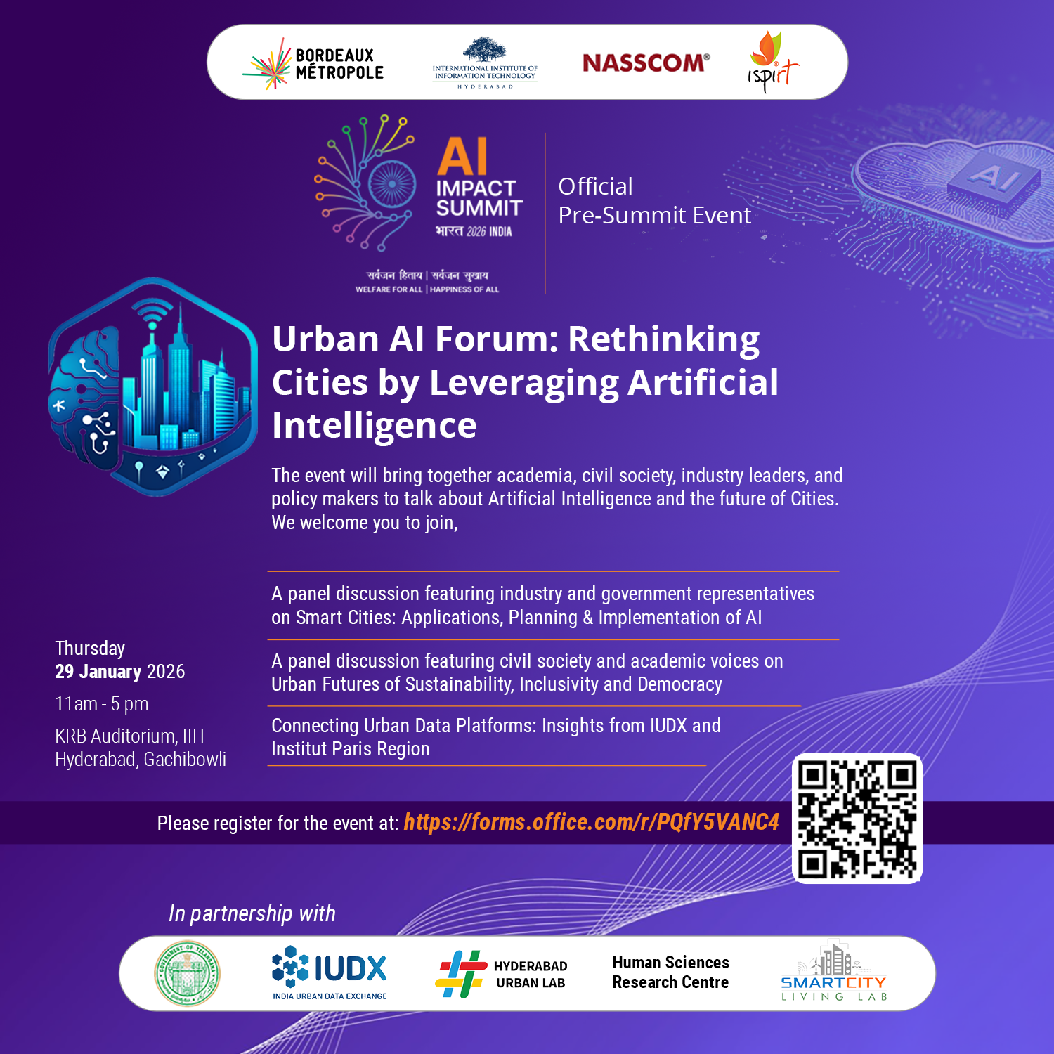 Urban AI Forum: Rethinking Cities by Leveraging Artificial IntelligenceDate: Thursday, 29 January, 2026 Time: 11:00am to 05:00pm Venue: KRB Auditorium, IIIT Hyderabad, Gachibowli | ![]() |
